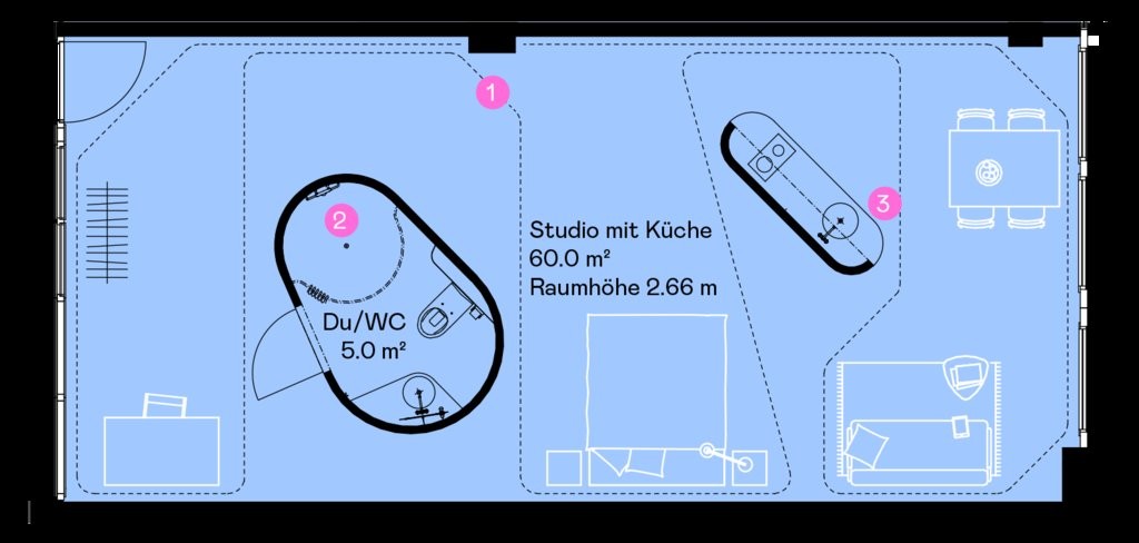 Dieses attraktive Studio bietet viel Raum für komfortables Wohnen und eignet sich ideal für Einzelpersonen, die grosszügiges und modernes Wohnen schätzen.